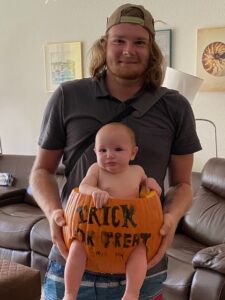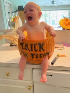 Halloween is my favorite holiday, by far. We prepared by carving a pumpkin big enough to fit N in. She was not thrilled.