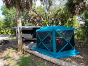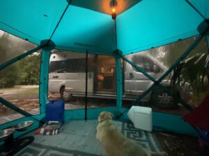 The best thing about the van is you can “live” anywhere. So I set up camp in the driveway and ordered a pop up tent to keep the rain and skeeters away and give me an outdoor living space.