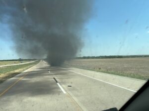 As we headed into the heartland of the country, we started experiencing extreme heat. I’m not sure it was related to weather, but we passed a semi that we could see smoke coming off the rear trailer tires. I had a handheld CB in the van, but it seems truckers don’t use CBs anymore, so I had no way to let the driver know. We pulled off for a gas break shortly after and filled up before rejoining the interstate. Not much later, we spotted black smoke up ahead so thick, you couldn’t see what it was coming from. It turned out to be the same semi, now with the back end of the trailer on fire. A fire truck was already there.