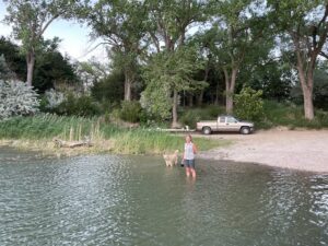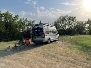 I found us a spot on a lake well off the interstate. The road getting in was a bit sketchy – dry rutted dirt. Most of the sites looked intended for lifted 4×4 vehicles, but we found a spot at the top of a small hill. We walked down to the lake to wade in it and let Riley cool off. The generator is super loud, so we didn’t run it at all, including for AC, but probably should have. We did have enough battery power to run the ceiling MaxxAir fan with all the windows open. It wasn’t too bad after the sun went down, but bad enough that we were going to find a place with power the next night.