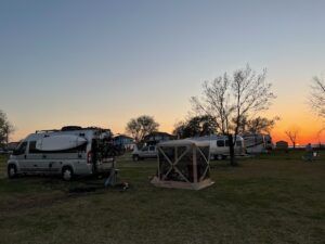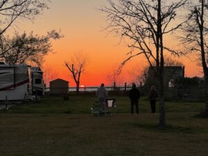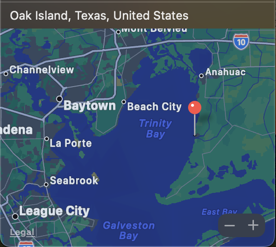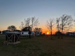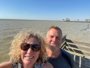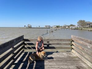 We made our way to the Gulf Coast of Texas, where we booked a Harvest Host at Frascone Winery just south of Anahuac. It was situated in a small semi-rural coastal residential neighborhood with a large field across the street where the RVs parked. We took a walk down to the water (quite windy!) and sampled some snacks and wine in the tasting room. Very nice! Riley even made a friend.