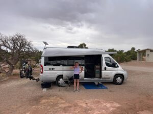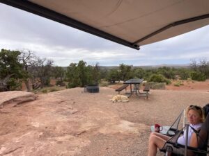 We arrived in Moab and found a BLM campground with hardly anyone in it – Horsethief Campground. It was the first time I experienced having to pay for a BLM site, but the campground was super nice with numbered sites and flat parking pads. We arrived after dark, so waited to hit up the self-pay kiosk for morning when we could find it.