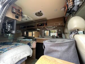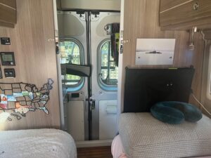 In order to run the Starlink router and TV without draining the house AGM batteries (200ah), I also bought a power station and charger for the lighter plug, as well as a folding solar panel. We added a travel map to the back wall, and my metal print of Caleb arrived and was affixed to the other back wall, replacing some campy “art” I had initially stuck there. We were turning the van more into a tiny house than a camping tent.