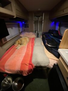 Riley insisted on sleeping with me and the smaller-than-twin beds meant with her sharing, my feet were hanging out in the air. The K model of Travatos are supposed to have a way to put the table in between the beds to make one big bed, more like a Queen size, but ours was missing the poles that extended from under the driver’s bed. I had stopped at a Home Depot in Illinois (ah, yes, I did stay at my parents!), left the generator running with the AC on in the coach for Riley, while I ran into the store in search of the right sized posts.