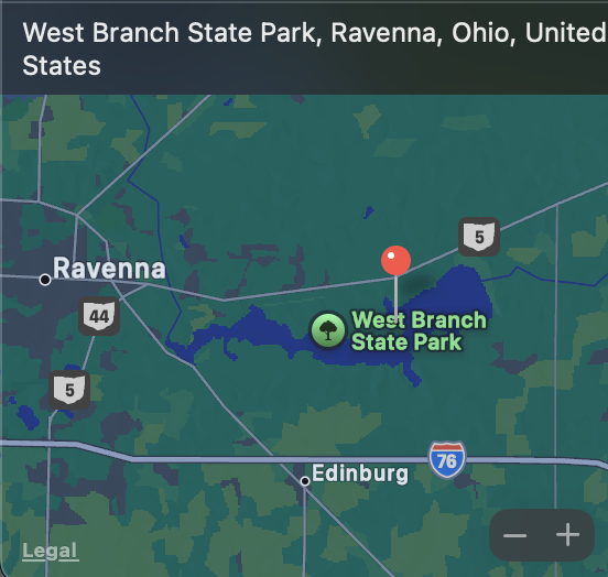 I seem to be missing a day here. I suspect I stopped at one of my parents’ houses in Illinois before resuming the trek. Found a nice spot on another lake in Ohio at a state park. The site backed right up to the water. Bushes were planted between all the sites, giving a nice private feeling, although I could hear the party (football game?) going on next to me 🙂