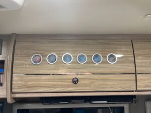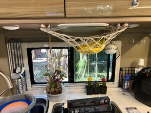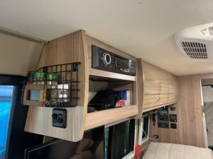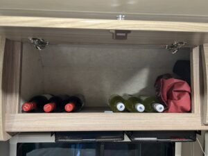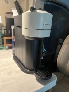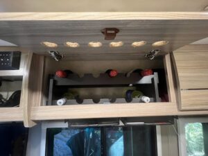 KT also came up with an idea to put a wine rack in one of our cabinets. It turned out pretty sharp! We also added a couple wire racks for storage of spices and bug spray, lotion, etc. I also found a solution to storing fruit without it rolling all over the place or taking up precious cabinet space. And by this point I had ordered a Nespresso maker and was finally enjoying really good coffee immediately upon waking 🙂